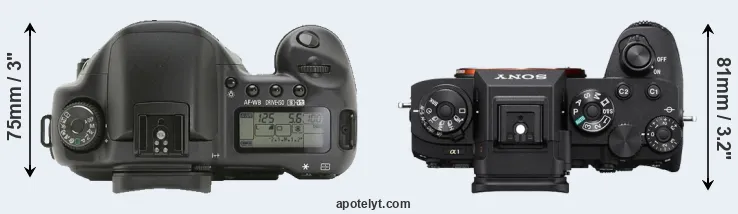 The physical size and weight of the Canon 10D and the Sony A1 are illustrated in the side-by-side display below. The two cameras are presented according to their relative size. Three consecutive views from the front, the top, and the rear side are shown. All width, height and depth measures are rounded to the nearest millimeter.