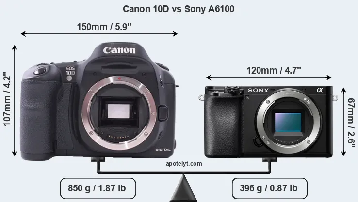 If the front view area (width x height) of the cameras is taken as an aggregate measure of their size, the Sony A6100 is considerably smaller (50 percent) than the Canon 10D. Moreover, the A6100 is substantially lighter (53 percent) than the 10D. In this context, it is worth noting that neither the 10D nor the A6100 are weather-sealed.