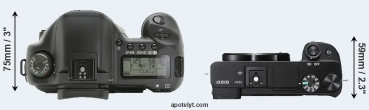The physical size and weight of the Canon 10D and the Sony A6100 are illustrated in the side-by-side display below. The two cameras are presented according to their relative size. Three consecutive views from the front, the top, and the rear side are shown. All size dimensions are rounded to the nearest millimeter.