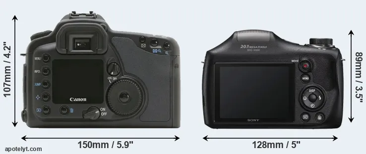 Going beyond this snapshot of core features and characteristics, what are the differences between the Canon EOS 10D and the Sony Cyber-shot DSC-H300? Which one should you buy? Read on to find out how these two cameras compare with respect to their body size, their imaging sensors, their shooting features, their input-output connections, and their reception by expert reviewers.