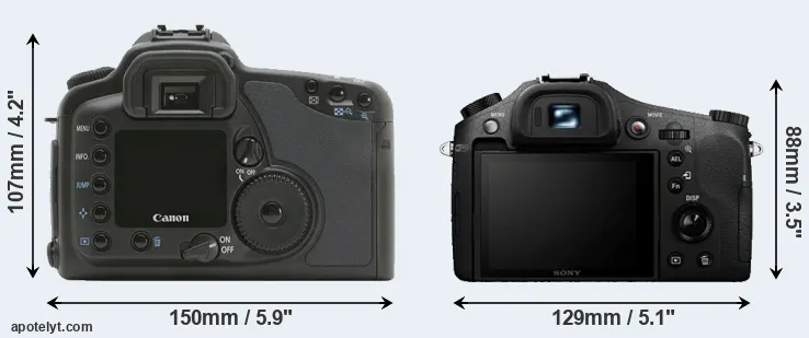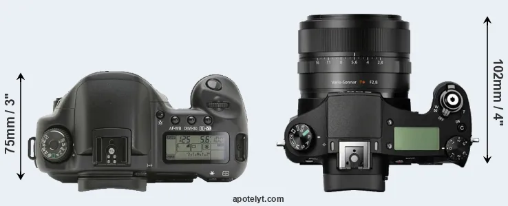 The physical size and weight of the Canon 10D and the Sony RX10 are illustrated in the side-by-side display below. The two cameras are presented according to their relative size. Three consecutive views from the front, the top, and the rear side are shown. All size dimensions are rounded to the nearest millimeter.