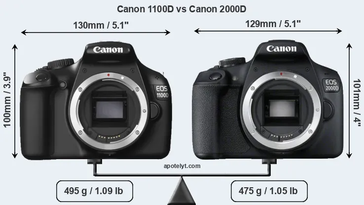The physical size and weight of the Canon 1100D and the Canon 2000D are illustrated in the side-by-side display below. The two cameras are presented according to their relative size. Three consecutive views from the front, the top, and the rear side are shown. All width, height and depth dimensions are rounded to the nearest millimeter.