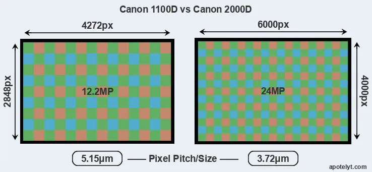 With 24MP, the 2000D offers a higher resolution than the 1100D (12.2MP), but the 2000D has smaller individual pixels (pixel pitch of 3.72μm versus 5.15μm for the 1100D). Yet, the 2000D is a much more recent model (by 7 years) than the 1100D, and its sensor will have benefitted from technological advances during this time that enhance the light gathering capacity of its pixel-units.
