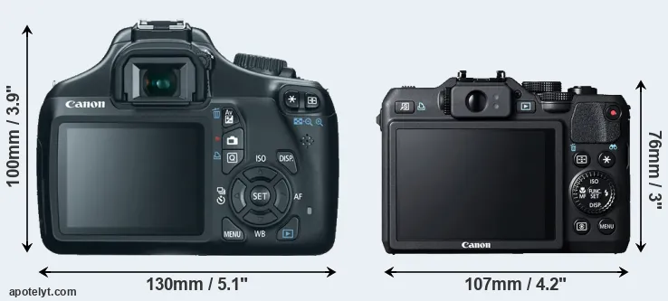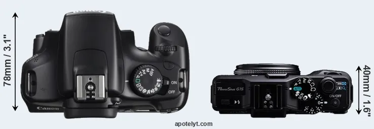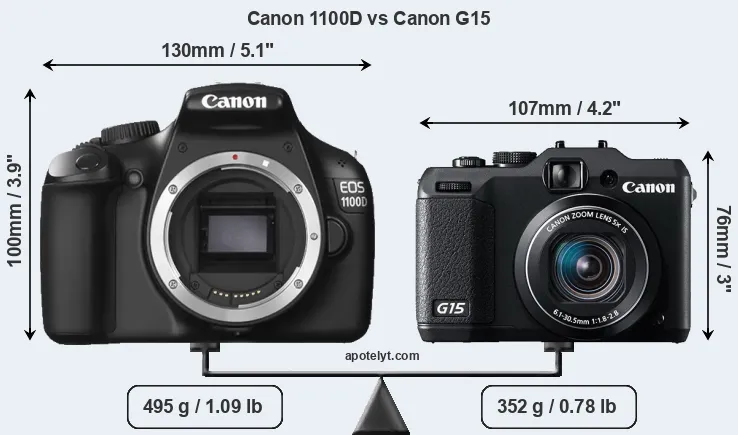 The side-by-side display below illustrates the physical size and weight of the Canon 1100D and the Canon G15. The two cameras are presented according to their relative size. Three consecutive perspectives from the front, the top, and the back are available. All width, height and depth measures are rounded to the nearest millimeter.