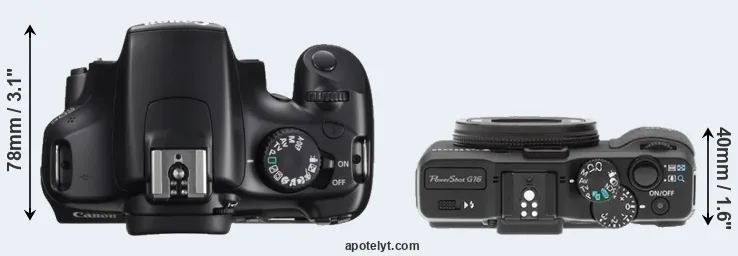 The side-by-side display below illustrates the physical size and weight of the Canon 1100D and the Canon G16. The two cameras are presented according to their relative size. Three consecutive perspectives from the front, the top, and the back are available. All width, height and depth measures are rounded to the nearest millimeter.