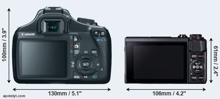 The above size and weight comparisons are to some extent incomplete and possibly misleading, as the G7X Mark II has a lens built in, whereas the 1100D is an interchangeable lens camera that requires a separate lens. Attaching the latter will add extra weight and bulk to the setup. You can compare the optics available for the 1100D and their specifications in the Canon EF Lens Catalog.