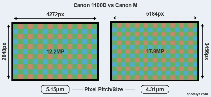 With 17.9MP, the Canon M offers a higher resolution than the 1100D (12.2MP), but the Canon M has smaller individual pixels (pixel pitch of 4.31μm versus 5.15μm for the 1100D). Yet, the Canon M is a somewhat more recent model (by 1 year and 5 months) than the 1100D, and its sensor might have benefitted from technological advances during this time that enhance the light gathering capacity of its pixel-units.