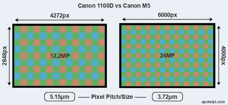 With 24MP, the M5 offers a higher resolution than the 1100D (12.2MP), but the M5 has smaller individual pixels (pixel pitch of 3.72μm versus 5.15μm for the 1100D). Yet, the M5 is a much more recent model (by 5 years and 7 months) than the 1100D, and its sensor will have benefitted from technological advances during this time that enhance the light gathering capacity of its pixel-units.