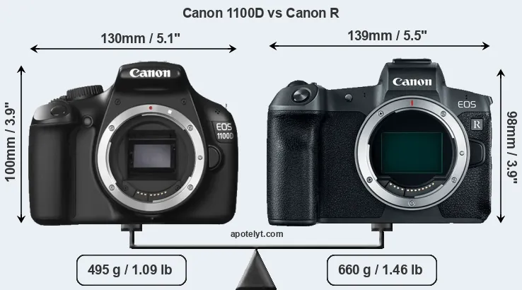 If the front view area (width x height) of the cameras is taken as an aggregate measure of their size, the Canon R is somewhat larger (5 percent) than the Canon 1100D. Moreover, the Canon R is markedly heavier (33 percent) than the 1100D. It is noteworthy in this context that the Canon R is splash and dust-proof, while the 1100D does not feature any corresponding weather-sealing.