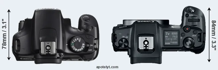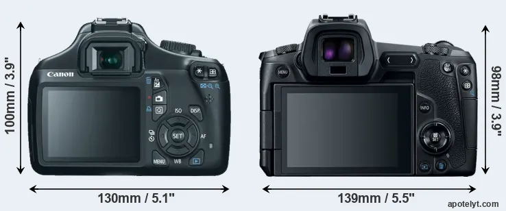 The physical size and weight of the Canon 1100D and the Canon R are illustrated in the side-by-side display below. The two cameras are presented according to their relative size. Three successive views from the front, the top, and the rear are shown. All width, height and depth measures are rounded to the nearest millimeter.