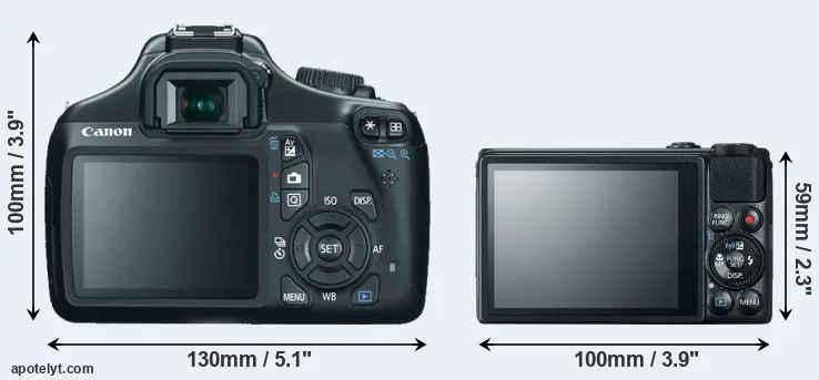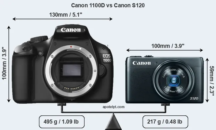 The physical size and weight of the Canon 1100D and the Canon S120 are illustrated in the side-by-side display below. The two cameras are presented according to their relative size. Three consecutive views from the front, the top, and the rear side are shown. All width, height and depth measures are rounded to the nearest millimeter.