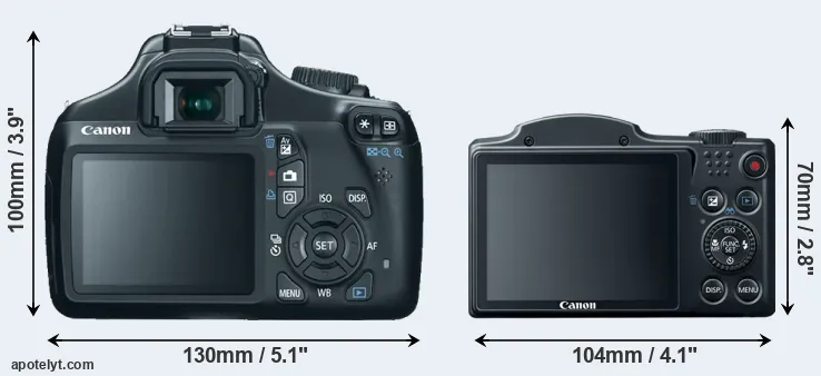 The physical size and weight of the Canon 1100D and the Canon SX500 are illustrated in the side-by-side display below. The two cameras are presented according to their relative size. Three consecutive perspectives from the front, the top, and the back are available. All width, height and depth dimensions are rounded to the nearest millimeter.