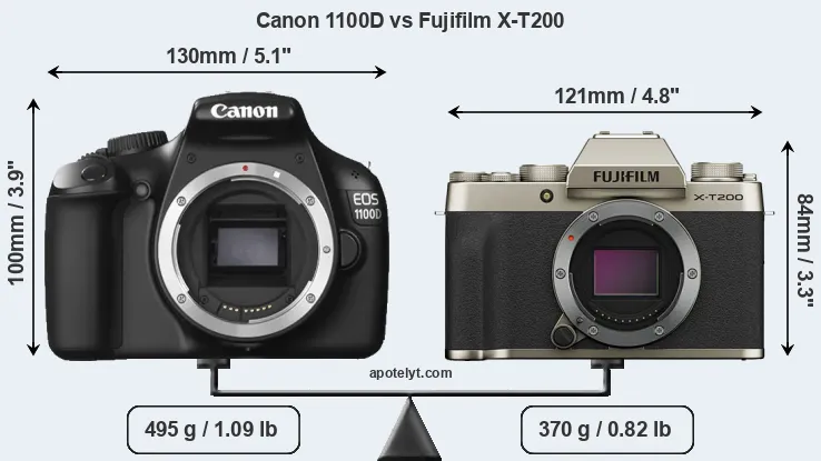 An illustration of the physical size and weight of the Canon 1100D and the Fujifilm X-T200 is provided in the side-by-side display below. The two cameras are presented according to their relative size. Three successive views from the front, the top, and the rear are shown. All width, height and depth dimensions are rounded to the nearest millimeter.