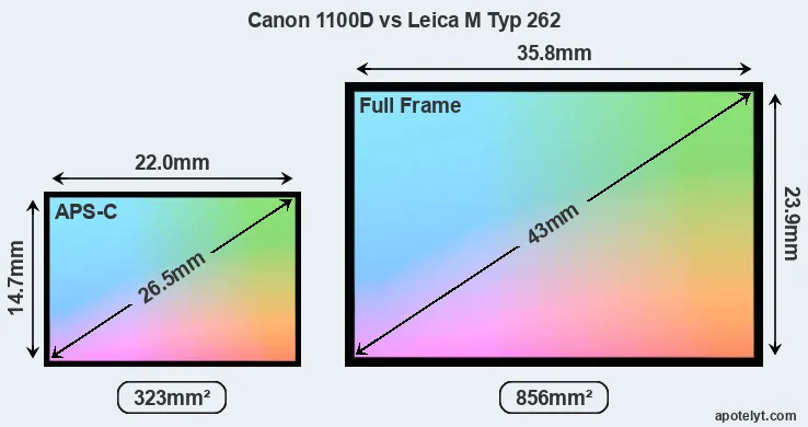 Of the two cameras under consideration, the Canon 1100D features an APS-C sensor and the Leica M Typ 262 a full frame sensor. The sensor area in the M Typ 262 is 165 percent bigger. As a result of these sensor size differences, the cameras have a format factor of, respectively, 1.6 and 1.0. Both cameras have a native aspect ratio (sensor width to sensor height) of 3:2.