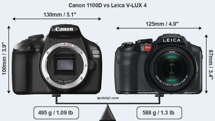 An illustration of the physical size and weight of the Canon 1100D and the Leica V-LUX 4 is provided in the side-by-side display below. The two cameras are presented according to their relative size. Three successive views from the front, the top, and the rear are shown. All width, height and depth measures are rounded to the nearest millimeter.
