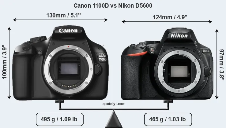 The physical size and weight of the Canon 1100D and the Nikon D5600 are illustrated in the side-by-side display below. The two cameras are presented according to their relative size. Three successive views from the front, the top, and the rear are shown. All width, height and depth measures are rounded to the nearest millimeter.