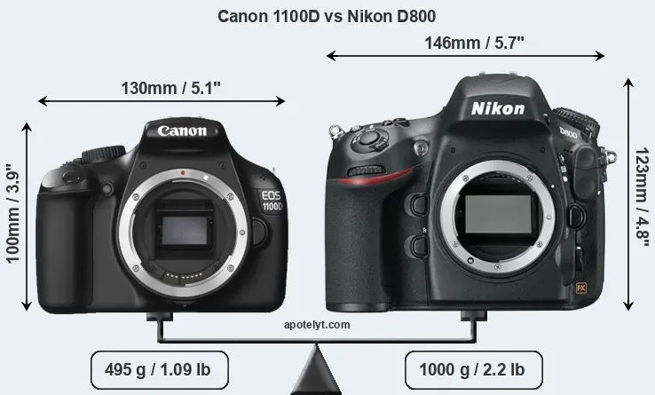 If the front view area (width x height) of the cameras is taken as an aggregate measure of their size, the Nikon D800 is notably larger (38 percent) than the Canon 1100D. Moreover, the D800 is substantially heavier (102 percent) than the 1100D. It is noteworthy in this context that the D800 is splash and dust-proof, while the 1100D does not feature any corresponding weather-sealing.