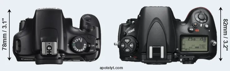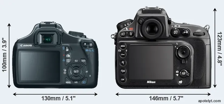 The side-by-side display below illustrates the physical size and weight of the Canon 1100D and the Nikon D800. The two cameras are presented according to their relative size. Three successive views from the front, the top, and the rear are shown. All size dimensions are rounded to the nearest millimeter.