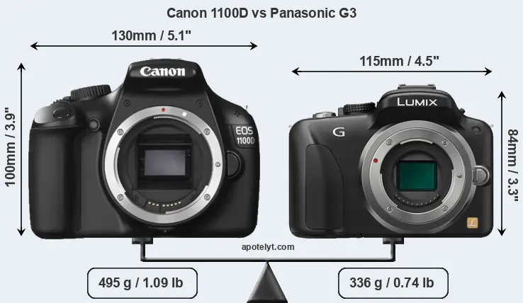 An illustration of the physical size and weight of the Canon 1100D and the Panasonic G3 is provided in the side-by-side display below. The two cameras are presented according to their relative size. Three consecutive views from the front, the top, and the rear side are shown. All width, height and depth measures are rounded to the nearest millimeter.