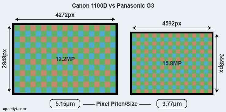 Despite having a smaller sensor, the G3 offers a higher resolution of 15.8 megapixels, compared with 12.2 MP of the 1100D. This megapixels advantage comes at the cost of a higher pixel density and a smaller size of the individual pixel (with a pixel pitch of 3.77μm versus 5.15μm for the 1100D). However, it should be noted that the G3 is a somewhat more recent model (by 3 months) than the 1100D, and its sensor might have benefitted from technological advances during this time that partly offset its pixel-size disadvantage.