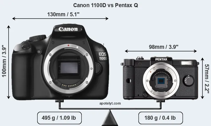 An illustration of the physical size and weight of the Canon 1100D and the Pentax Q is provided in the side-by-side display below. The two cameras are presented according to their relative size. Three consecutive perspectives from the front, the top, and the back are available. All size dimensions are rounded to the nearest millimeter.