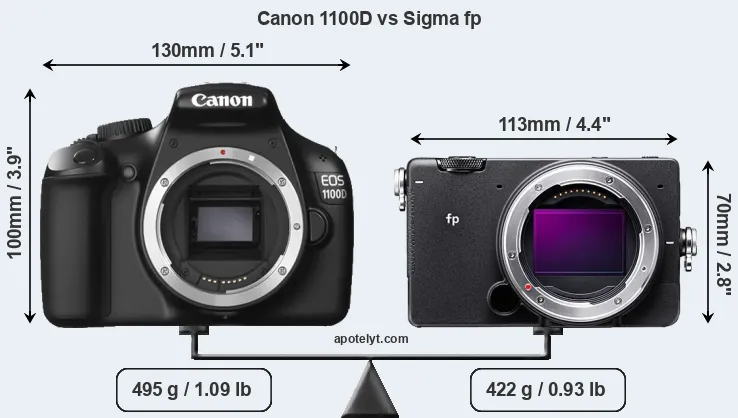 If the front view area (width x height) of the cameras is taken as an aggregate measure of their size, the Sigma fp is considerably smaller (39 percent) than the Canon 1100D. Moreover, the fp is markedly lighter (15 percent) than the 1100D. It is noteworthy in this context that the fp is splash and dust-proof, while the 1100D does not feature any corresponding weather-sealing.