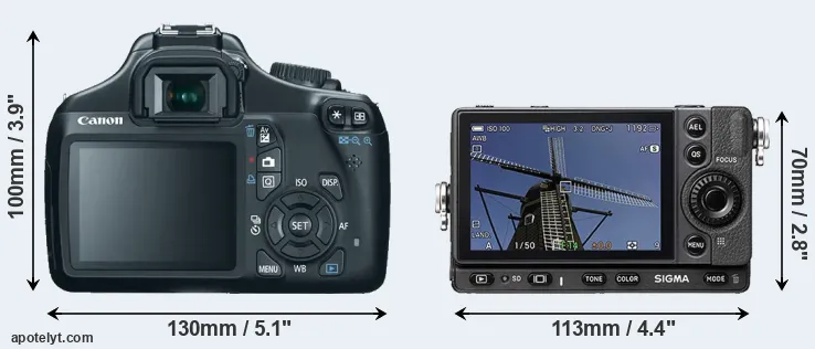 An illustration of the physical size and weight of the Canon 1100D and the Sigma fp is provided in the side-by-side display below. The two cameras are presented according to their relative size. Three consecutive perspectives from the front, the top, and the back are available. All size dimensions are rounded to the nearest millimeter.