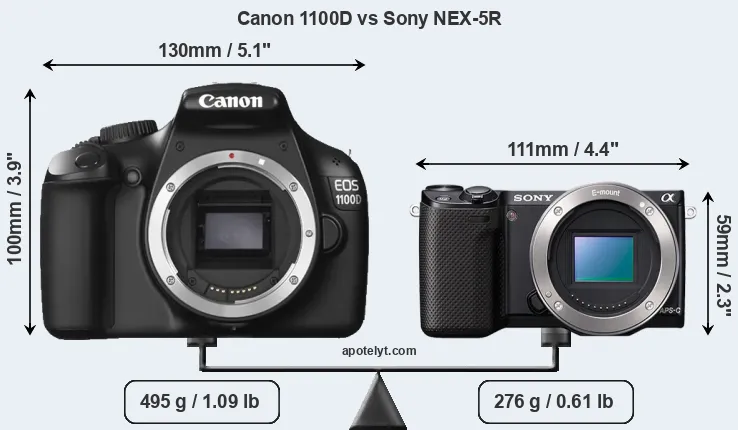 If the front view area (width x height) of the cameras is taken as an aggregate measure of their size, the Sony NEX-5R is considerably smaller (50 percent) than the Canon 1100D. Moreover, the NEX-5R is substantially lighter (44 percent) than the 1100D. In this context, it is worth noting that neither the 1100D nor the NEX-5R are weather-sealed.