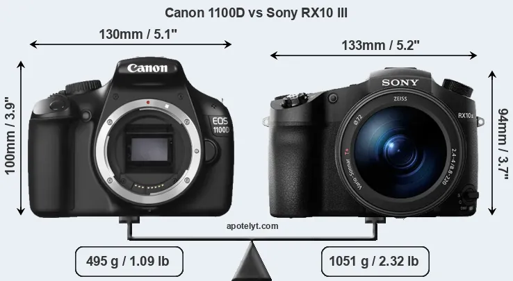 The side-by-side display below illustrates the physical size and weight of the Canon 1100D and the Sony RX10 III. The two cameras are presented according to their relative size. Three consecutive perspectives from the front, the top, and the back are available. All width, height and depth measures are rounded to the nearest millimeter.