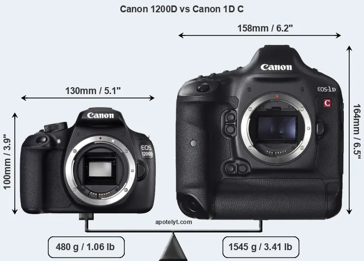 The side-by-side display below illustrates the physical size and weight of the Canon 1200D and the Canon 1D C. The two cameras are presented according to their relative size. Three successive views from the front, the top, and the rear are shown. All width, height and depth measures are rounded to the nearest millimeter.