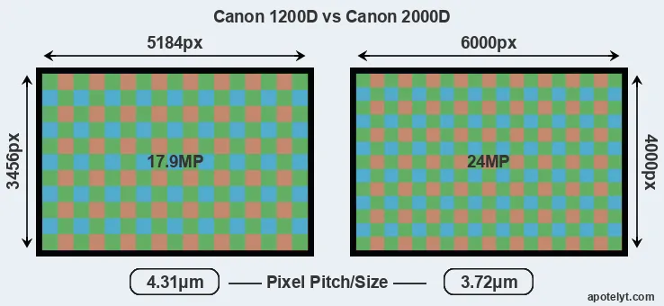 While the two cameras under review share the same sensor size, the 2000D offers a higher resolution of 24 megapixels, compared with 17.9 MP of the 1200D. This megapixels advantage translates into a 16 percent gain in linear resolution. On the other hand, these sensor specs imply that the 2000D has a higher pixel density and a smaller size of the individual pixel (with a pixel pitch of 3.72μm versus 4.31μm for the 1200D). However, it should be noted that the 2000D is much more recent (by 4 years) than the 1200D, and its sensor will have benefitted from technological advances during this time that compensate for the smaller pixel size.
