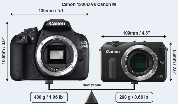 If the front view area (width x height) of the cameras is taken as an aggregate measure of their size, the Canon M is considerably smaller (45 percent) than the Canon 1200D. Moreover, the Canon M is substantially lighter (38 percent) than the 1200D. In this context, it is worth noting that neither the 1200D nor the Canon M are weather-sealed.