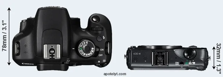 The side-by-side display below illustrates the physical size and weight of the Canon 1200D and the Canon M. The two cameras are presented according to their relative size. Three successive views from the front, the top, and the rear are shown. All width, height and depth measures are rounded to the nearest millimeter.