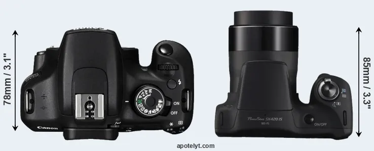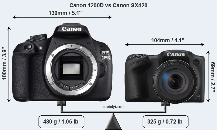 An illustration of the physical size and weight of the Canon 1200D and the Canon SX420 is provided in the side-by-side display below. The two cameras are presented according to their relative size. Three consecutive perspectives from the front, the top, and the back are available. All size dimensions are rounded to the nearest millimeter.