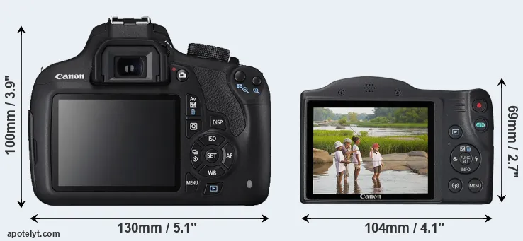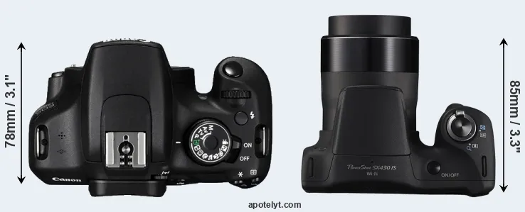An illustration of the physical size and weight of the Canon 1200D and the Canon SX430 is provided in the side-by-side display below. The two cameras are presented according to their relative size. Three consecutive perspectives from the front, the top, and the back are available. All size dimensions are rounded to the nearest millimeter.
