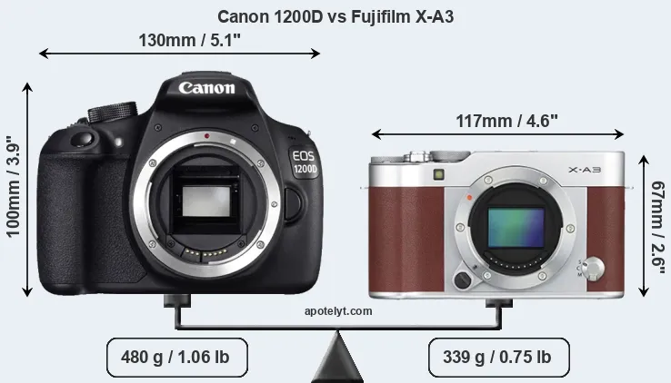 The side-by-side display below illustrates the physical size and weight of the Canon 1200D and the Fujifilm X-A3. The two cameras are presented according to their relative size. Three consecutive perspectives from the front, the top, and the back are available. All size dimensions are rounded to the nearest millimeter.