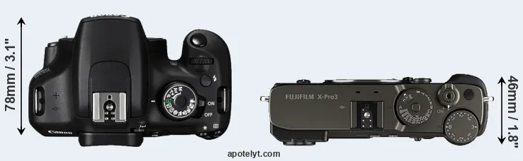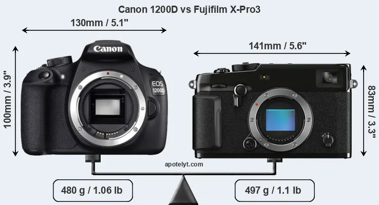 The side-by-side display below illustrates the physical size and weight of the Canon 1200D and the Fujifilm X-Pro3. The two cameras are presented according to their relative size. Three successive views from the front, the top, and the rear are shown. All size dimensions are rounded to the nearest millimeter.