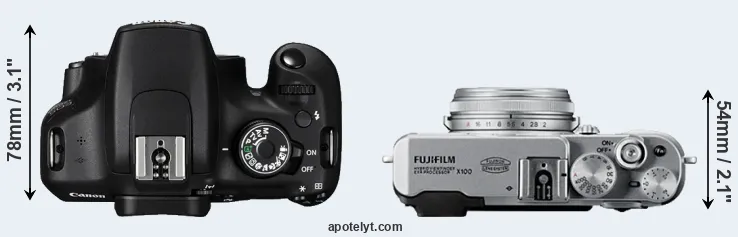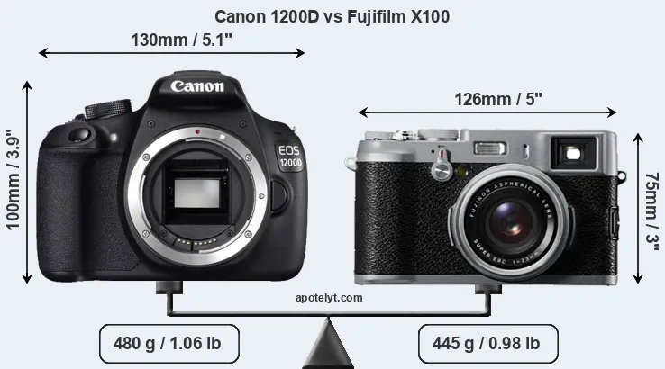 An illustration of the physical size and weight of the Canon 1200D and the Fujifilm X100 is provided in the side-by-side display below. The two cameras are presented according to their relative size. Three consecutive perspectives from the front, the top, and the back are available. All size dimensions are rounded to the nearest millimeter.