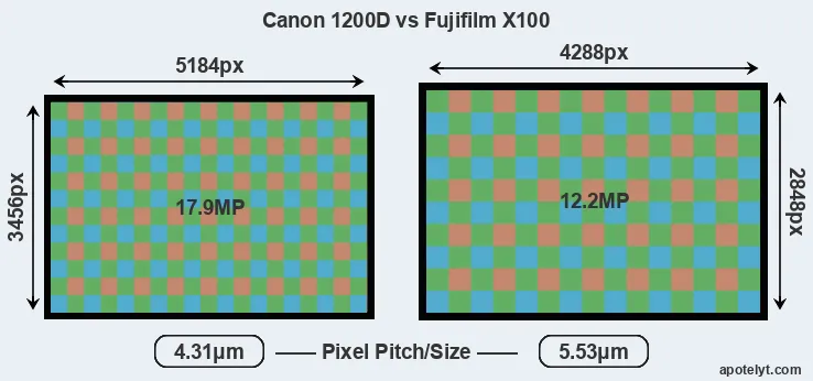 Despite having a smaller sensor, the Canon 1200D offers a higher resolution of 17.9 megapixels, compared with 12.2 MP of the Fujifilm X100. This megapixels advantage comes at the cost of a higher pixel density and a smaller size of the individual pixel (with a pixel pitch of 4.31μm versus 5.53μm for the X100). However, it should be noted that the 1200D is much more recent (by 3 years and 4 months) than the X100, and its sensor will have benefitted from technological advances during this time that make it possible to gather light more efficiently.