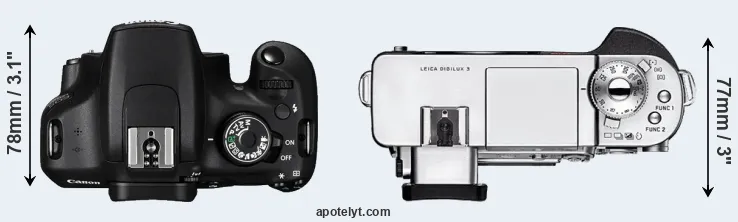 The physical size and weight of the Canon 1200D and the Leica Digilux 3 are illustrated in the side-by-side display below. The two cameras are presented according to their relative size. Three successive views from the front, the top, and the rear are shown. All width, height and depth measures are rounded to the nearest millimeter.