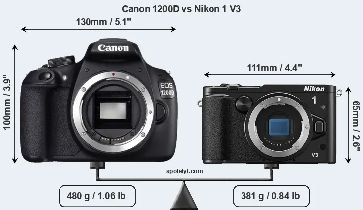 The physical size and weight of the Canon 1200D and the Nikon 1 V3 are illustrated in the side-by-side display below. The two cameras are presented according to their relative size. Three consecutive views from the front, the top, and the rear side are shown. All size dimensions are rounded to the nearest millimeter.