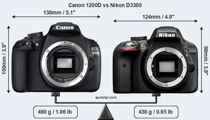 An illustration of the physical size and weight of the Canon 1200D and the Nikon D3300 is provided in the side-by-side display below. The two cameras are presented according to their relative size. Three consecutive views from the front, the top, and the rear side are shown. All width, height and depth measures are rounded to the nearest millimeter.