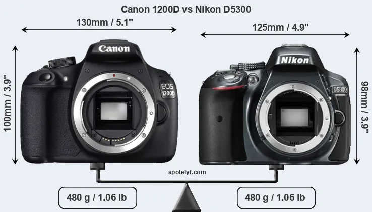 An illustration of the physical size and weight of the Canon 1200D and the Nikon D5300 is provided in the side-by-side display below. The two cameras are presented according to their relative size. Three consecutive views from the front, the top, and the rear side are shown. All width, height and depth measures are rounded to the nearest millimeter.