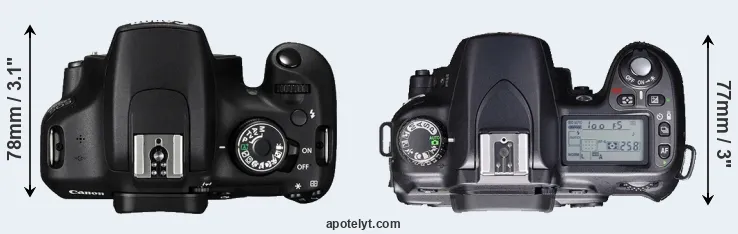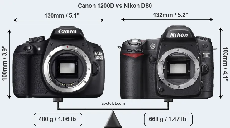 The physical size and weight of the Canon 1200D and the Nikon D80 are illustrated in the side-by-side display below. The two cameras are presented according to their relative size. Three consecutive views from the front, the top, and the rear side are shown. All width, height and depth measures are rounded to the nearest millimeter.