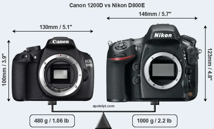 An illustration of the physical size and weight of the Canon 1200D and the Nikon D800E is provided in the side-by-side display below. The two cameras are presented according to their relative size. Three successive views from the front, the top, and the rear are shown. All size dimensions are rounded to the nearest millimeter.