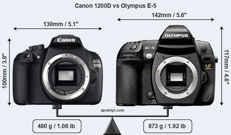 If the front view area (width x height) of the cameras is taken as an aggregate measure of their size, the Olympus E-5 is notably larger (28 percent) than the Canon 1200D. Moreover, the E-5 is substantially heavier (82 percent) than the 1200D. It is noteworthy in this context that the E-5 is splash and dust-proof, while the 1200D does not feature any corresponding weather-sealing.