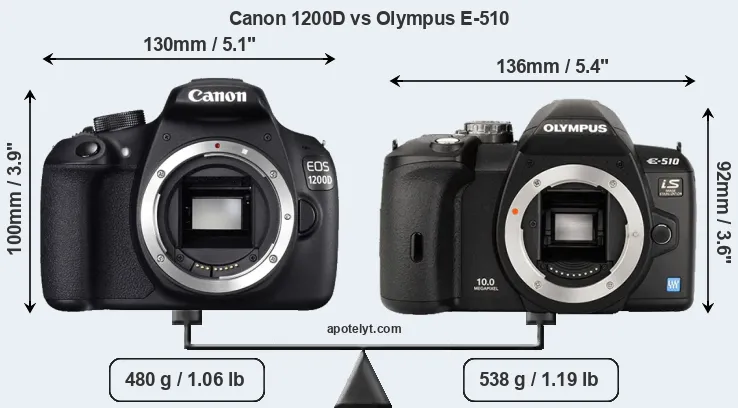 An illustration of the physical size and weight of the Canon 1200D and the Olympus E-510 is provided in the side-by-side display below. The two cameras are presented according to their relative size. Three successive views from the front, the top, and the rear are shown. All size dimensions are rounded to the nearest millimeter.