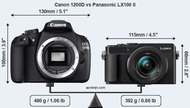 The above size and weight comparisons are to some extent incomplete and possibly misleading, as the LX100 II has a lens built in, whereas the 1200D is an interchangeable lens camera that requires a separate lens. Attaching the latter will add extra weight and bulk to the setup. You can compare the optics available for the 1200D and their specifications in the Canon EF Lens Catalog.
