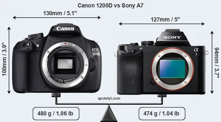 The physical size and weight of the Canon 1200D and the Sony A7 are illustrated in the side-by-side display below. The two cameras are presented according to their relative size. Three consecutive perspectives from the front, the top, and the back are available. All width, height and depth measures are rounded to the nearest millimeter.