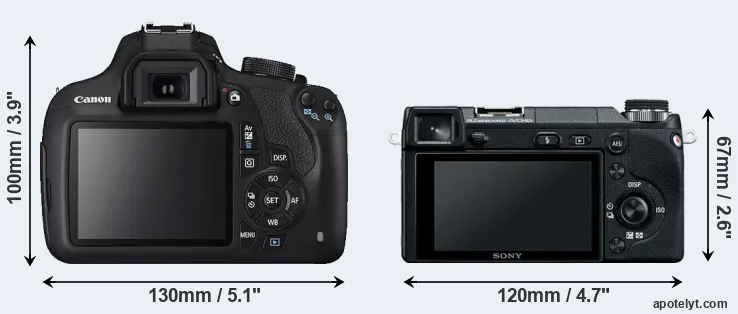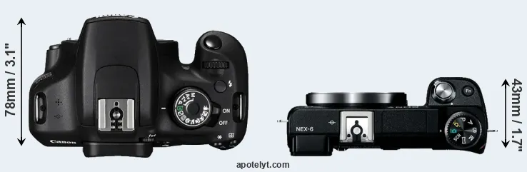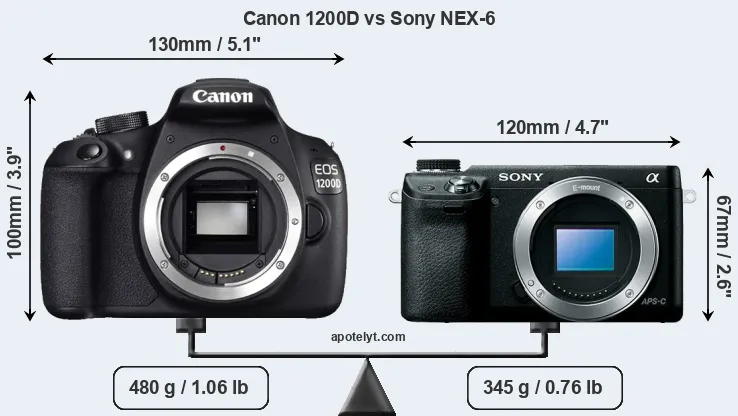The side-by-side display below illustrates the physical size and weight of the Canon 1200D and the Sony NEX-6. The two cameras are presented according to their relative size. Three consecutive perspectives from the front, the top, and the back are available. All width, height and depth measures are rounded to the nearest millimeter.